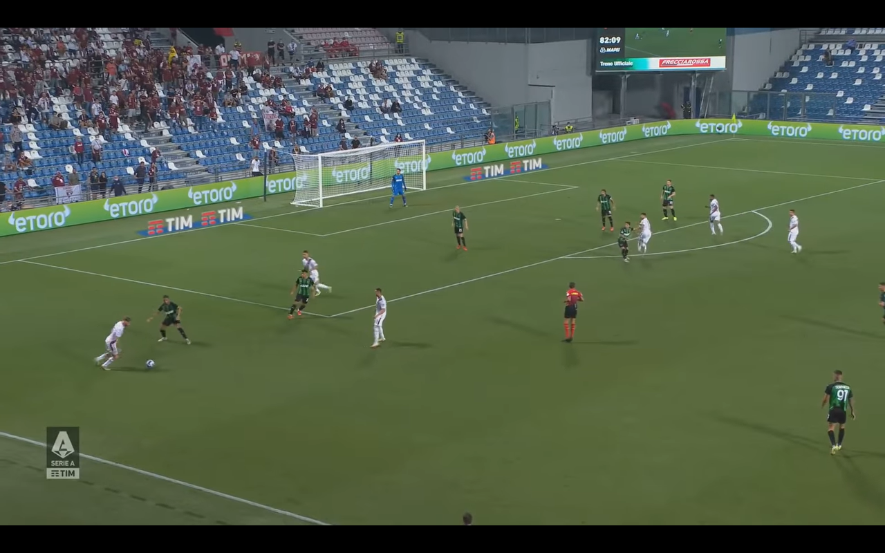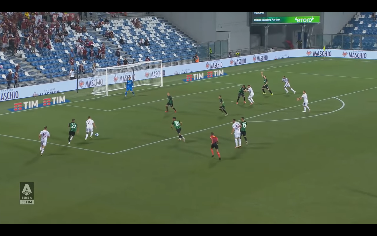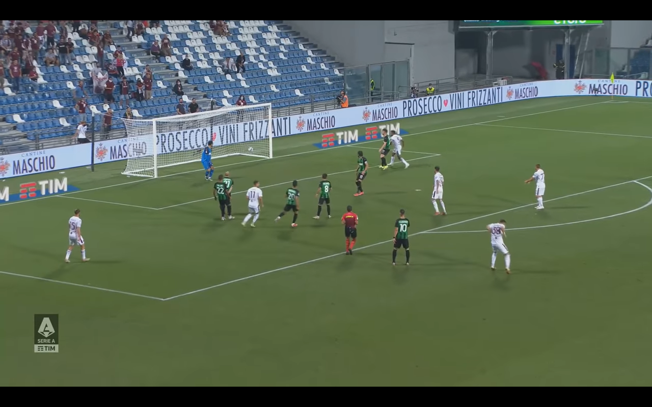 L'azione del gol nasce da un recupero palla nei pressi della linea laterale vicino alle panchina: i granata indemoniati vanno a triplicare la marcatura su Scamacca (Ansaldi, Rodriguez e Bremer). Alla fine è quest'ultimo che esce palla al piede dalla mischia e serve poi Mandragora per andare, notare bene, a sistemarsi a centro area per aspettare un eventuale cross (e si era ancora sullo 0-0).