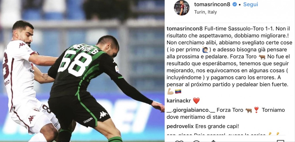 “Non cerchiamo alibi, abbiamo sbagliato, io per prima”. Arriva l’autocritica di Tomas Rincon, dopo l’errore che ha scaturito il gol del pareggio. Il venezuelano si è lasciato sfuggire Brignola che da corner ha trovato la rete del pareggio. “Non era il risultato che ci aspettavamo, dobbiamo migliorare! Non cerchiamo alibi, abbiamo sbagliato certe cose (io per primo). Adesso bisogna già pensare alla prossima partita e pedalare. Forza Toro!”. Queste le dichiarazioni del centrocampista scritte su un post su Instagram io giorno dopo il pareggio contro il Sassuolo che ha lasciato con l’amaro in bocca i granata.