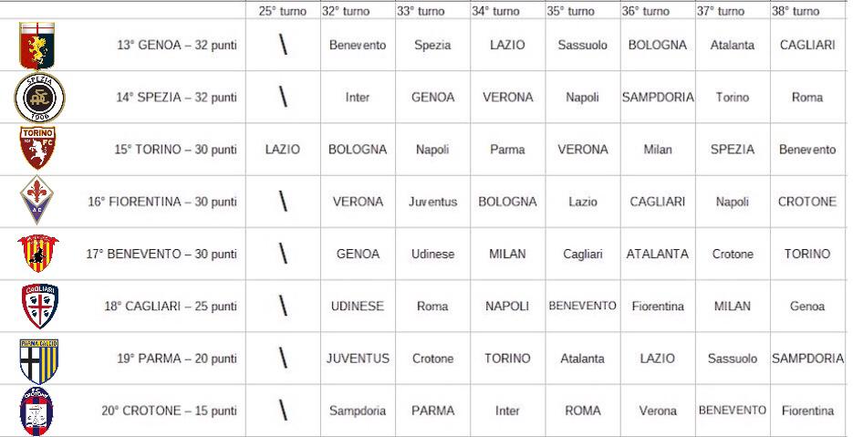 CONFRONTO CALENDARI - Nonostante restino solamente 7 giornate da disputare prima del termine del campionato, ci saranno ancora molti scontri diretti che determineranno la corsa salvezza. Contando Udinese e Bologna già virtualmente salve, sono ancora 8 le squadre che proveranno ad evitare lo spettro della Serie B. Il Parma e il Crotone sono certamente le due compagini più in difficoltà e avranno bisogno di un vero e proprio miracolo per riuscire a rimanere nella massima serie. Il Genoa e lo Spezia, invece, hanno un discreto margine di vantaggio sulla terzultima (7 punti) e quindi potranno giocare le ultime giornate con maggiore fiducia. La Fiorentina è attesa da alcune partite difficili in questo finale di stagione dato che dovrà affrontare Juventus, Lazio e Napoli oltre allo scontro diretto con il Cagliari della 36^ giornata che sarà un match chiave per decretare la salvezza di queste due squadre. Il Benevento invece dovrà giocare ben 4 spareggi salvezza in 7 partite dato che affronterà Genoa, Cagliari, Crotone e Torino. Il Cagliari, che attualmente occupa il 18° posto, è la squadra che rischia di più dato che nelle prossime giornate dovrà affrontare ben 3 squadre di alta classifica e altrettanti scontri diretti oltre a cercare di recuperare ben 5 punti per salvarsi. I sardi, infatti, affronteranno Roma, Napoli e Milan oltre alle dirette concorrenti Benevento, Fiorentina e Genoa.