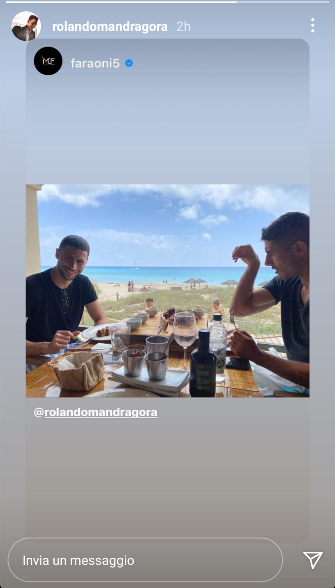 Rolando Mandragora è in vacanza con Davide Faraoni. Poco fa il centrocampista granata ha condiviso nelle sue storie di Instagram la foto pubblicata dal giocatore gialloblù. Come si può vedere, i due scherzano insieme in questi giorni di relax durante un pranzo con il mare alle spalle. E perché no? Magari alcune chiacchiere dell'ex e del futuro giocatore di Ivan Juric riguardano proprio il nuovo tecnico granata.