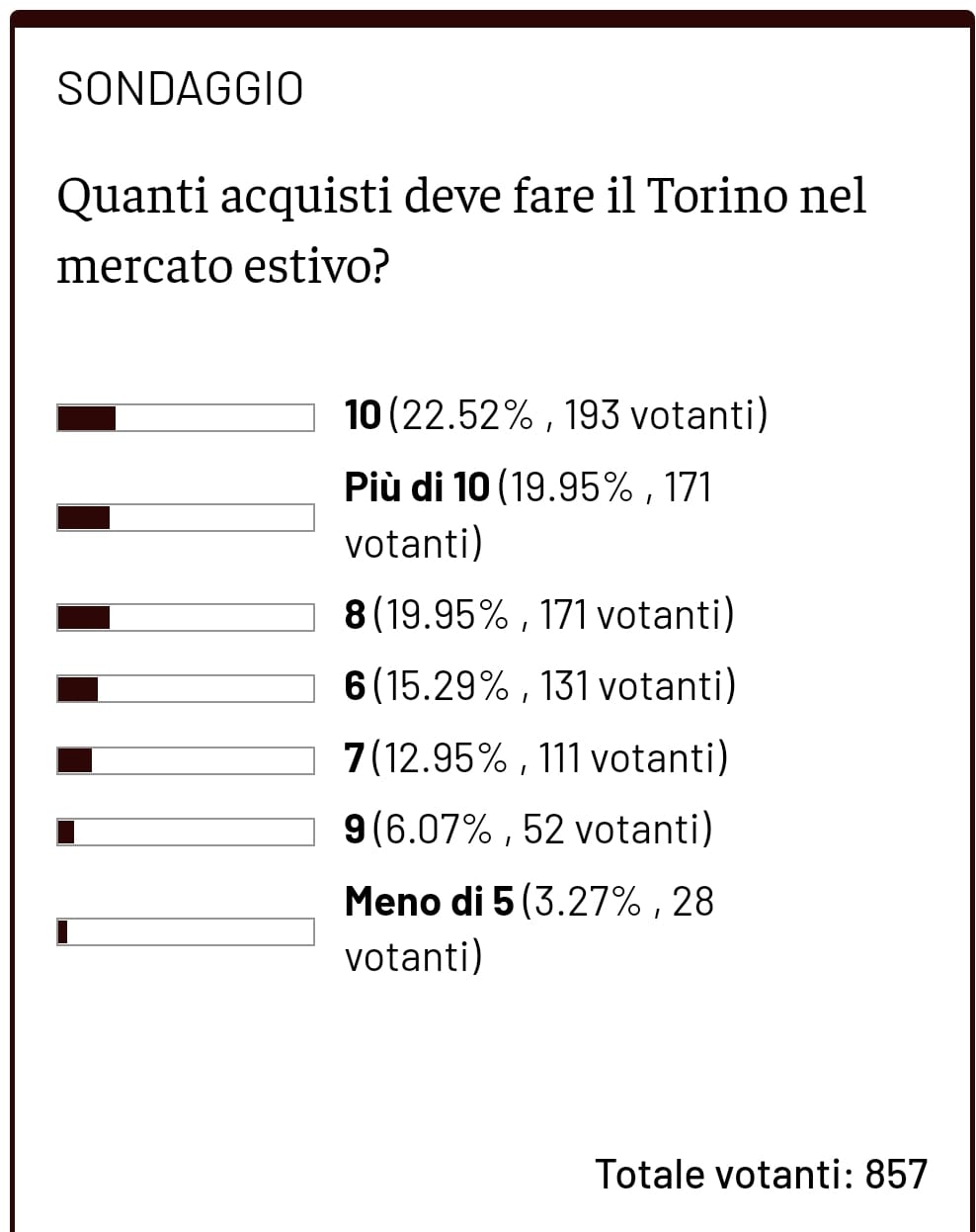 Si avvicina sempre più il primo luglio, giorno in cui inizierà ufficialmente la sessione estiva di calciomercato. Per questo nei giorni scorsi vi abbiamo posto, attraverso i nostri sondaggi, una duplice domanda: quanti acquisti deve fare il Torino nel mercato estivo? E considerato l'addio quasi certo di Belotti, bastano Sanabria e Pellegri a sostenere il peso dell'attacco? Per quanto riguarda il primo quesito, il 22.52% dei votanti (193 su 857 totali) ritiene che al Torino servano almeno dieci innesti; per 171 votanti invece ne servirebbero più di dieci, e lo stesso numero ritiene che ne bastino otto. Solo il 3.27% pensa che sarebbero sufficienti meno di cinque colpi di mercato. Passiamo alla seconda domanda, le cui risposte lasciano pochi dubbi: su 934 votanti ben 803 ritengono che Sanabria e Pellegri non siano sufficienti, e che serva almeno un altro attaccante per rinforzare il reparto offensivo.