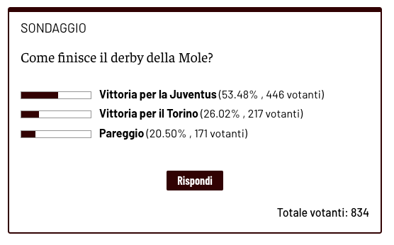 La maggior parte dei votanti, ovvero il 53,48%, crede nella vittoria dei bianconeri. Il 26,02 % pensa che il Torino riuscirà a fare risultato all'Allianz Stadium. Il restante, il 20.50, pensa che il derby della Mole si chiuderà con un punto a testa.