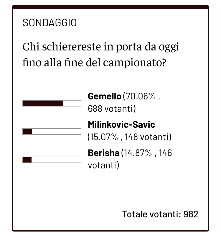 Come tutte le settimane, Toro News ieri pomeriggio - lunedì 28 marzo - ha passato la parola ai suoi lettori sull'argomento portiere: la situazione tra i pali del Torino non è tra le migliori, considerando le prestazioni altalenanti di Milinkovic-Savic prima e Berisha poi. Per questo, ai lettori di Toro News è stato chiesto di esprimere il loro parere su chi tra Milinkovic-Savic, Berisha e Gemello debba indossare la maglia da titolare nelle prossime partite del Torino: su un totale di 982 votanti, il 70% - ovvero 688 persone - ha ritenuto che Luca Gemello sia la scelta più corretta. Per pochi centesimi invece, Berisha e Milinkovic-Savic non sono sullo stesso livello: per il serbo, il 15.07% dei voti è a suo favore, mentre il restante 14.87% - ovvero un totale di 146 voti - è a favore dell'albanese.