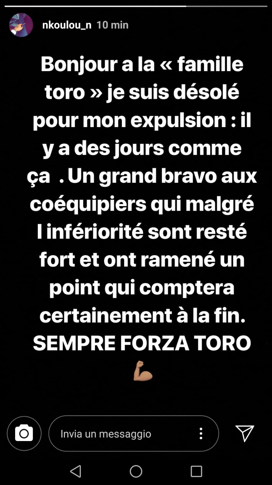 Ha scelto una stories su Instagram Nicolas Nkoulou, espulso durante la gara contro la Spal, per mandare un messaggio alla famiglia Toro:" Buongiorno alla "famiglia Toro" -scrive- Sono desolato per l'espulsione. Ci sono giorni così. Complimenti ai miei compagni che nonostante l'inferiorità sono rimasti forti e hanno portato a casa un punto che alla fine conterà sicuramente. Sempre forza Toro".