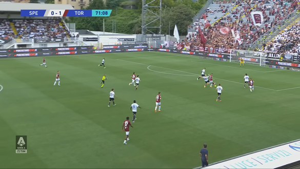 Il trequartista croato fa per accentrarsi verso l'area di rigore ma alzando la testa nota l'incredibile buco lasciato dalla difesa dello Spezia. Nell'immagine 3 viene inquadrato infatti il momento in cui Vlasic passa la palla a Ricci che si sta per inserire involandosi tutto solo verso la porta avversaria. Meriti di questo buco della retroguardia ligure vanno dati anche a Sanabria che essendo un centravanti di grande movimento ha costretto i difensori avversari a seguirlo per tutto il campo e svuotando di fatto l'area di rigore di Dragowski.