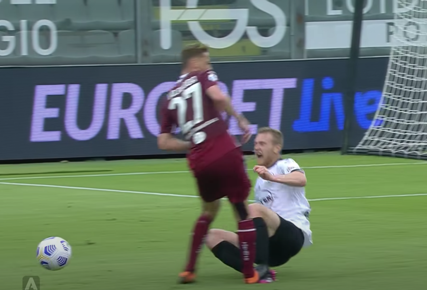 Lo Spezia raddoppia su rigore. Tutto nasce da un fallo di Vojvoda (graziato, perché già ammonito rischia il secondo giallo).