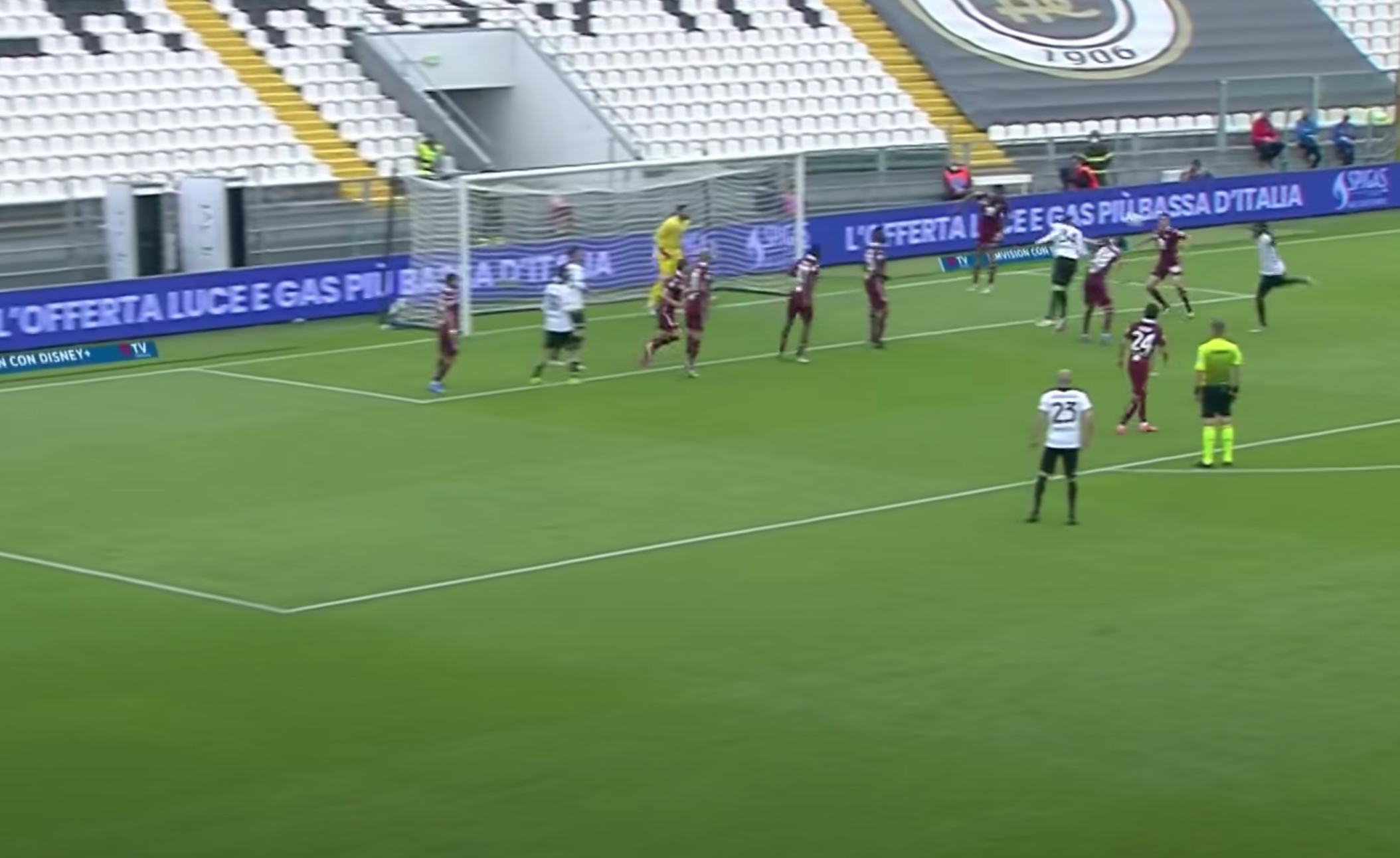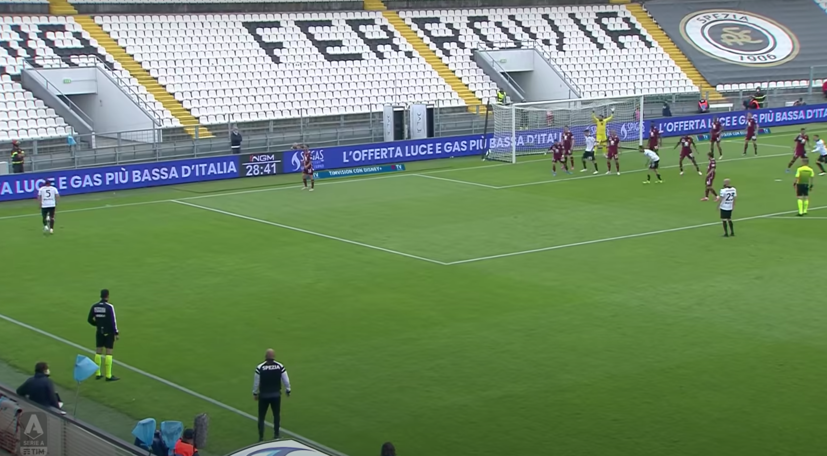 Il terzo gol dello Spezia è l'emblema dei problemi di concentrazione o comunque di testa del Torino. Punizione dalla sinistra battuta da Marchizza.