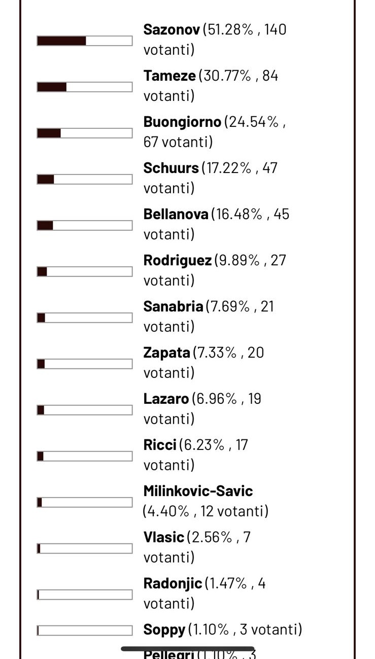 Prosegue il Toro News Award, il premio per il miglior calciatore granata che la redazione di Toro News assegna in base ai voti dei lettori. I risultati del sondaggio lanciato dopo Lazio-Torino hanno incoronato Saba Sazonov con 140 votati (51,28%). Seguono a ruota Tameze con 84 voti (30,77%) e infine Alessandro Buongiorno, uscito anzitempo dalla gara, ma che ha collezionato 67 voti (24.54%). Il difensore granata resta in testa alla classifica, ma ci sono delle new entry nella graduatoria.