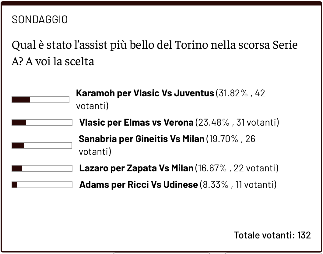 Il vincitore è stato Yann Karmaoh, che ha servito il passaggio chiave a Nikola Vlasic nel derby di ritorno tra Torino e Juventus. Per i lettori di Toro News è l'assist granata più bello della Serie A 2024/2025 con il 31.82% (42 votanti). Al secondo gradino del podio troviamo la palla servita da Vlasic ad Elmas nella sfida contro il Verona con solo 11 voti in meno e il 23.48%. Chiude il podio invece l'intelligente passato di Sanabria a Gineitis in occasione del gol del lituano contro il Milan, con 26 voti e il 19.70%. Fuori dal podio il cross di Lazaro per Zapata sempre contro i rossoneri con il 16.67% e il passaggio di Adams per Ricci contro l'Udinese con l'8.33%© RIPRODUZIONE RISERVATA
