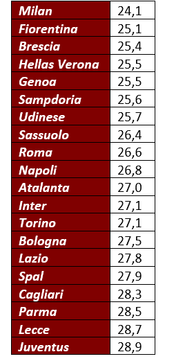 DI SEGUITO LA CLASSIFICA DELLA SERIE A PER ETÀ MEDIA: