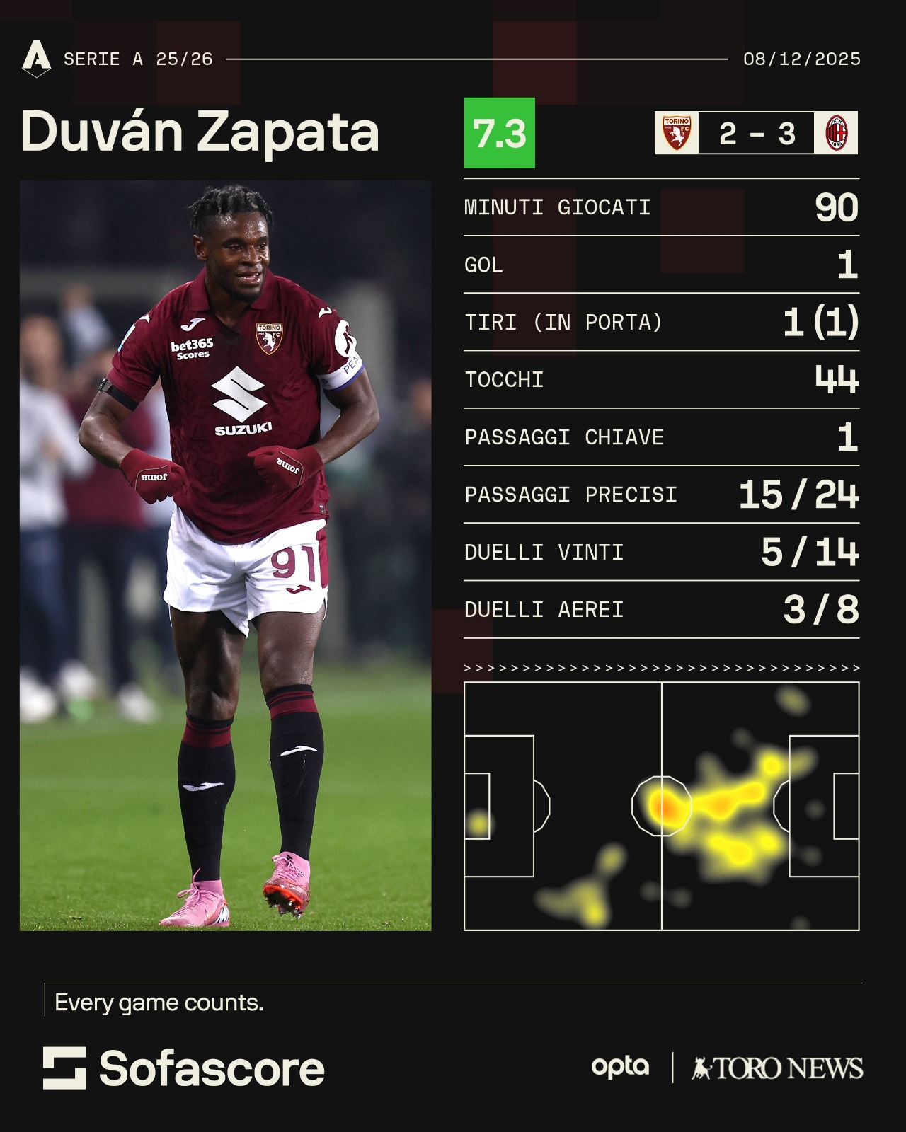 —Il match contro il Lecce aveva messo in mostra uno Zapata in netta ripresa. Molto attivo nei movimenti e arcigno nei duelli fisici, aveva dato sensazioni positive: forse una delle poche note liete di una gara negativa sotto molti punti di vista per il Torino. Quelle sensazioni sono state confermate nella gara contro il Milan.