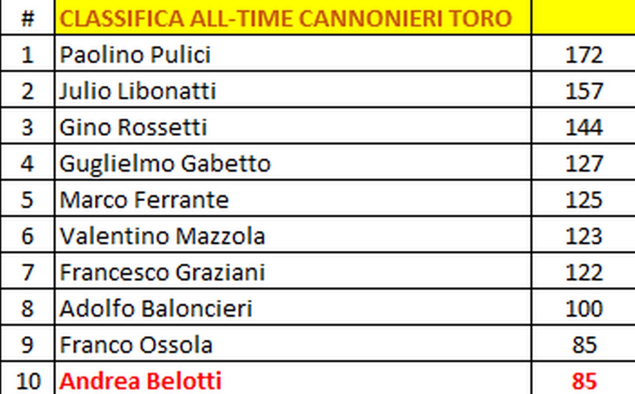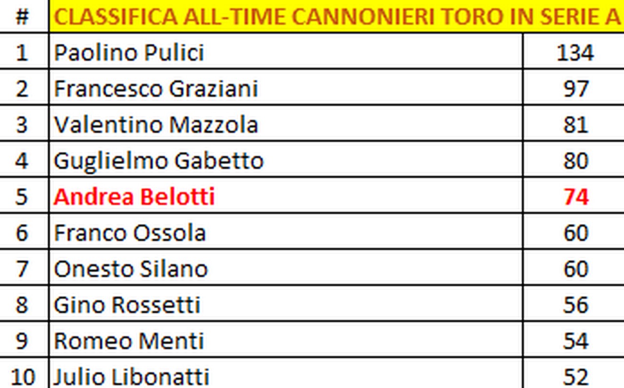 Prendendo in considerazione solo la Serie A a girone unico, invece, Belotti è già nella Top 5: si trova a quota 74 gol, e quest'anno può puntare a superare due mostri sacri del Grande Torino come Gabetto e Mazzola per issarsi al terzo posto, sul podio, in compagnia dei gemelli del gol Pulici e Graziani. Siamo insomma nell'Olimpo della storia granata.