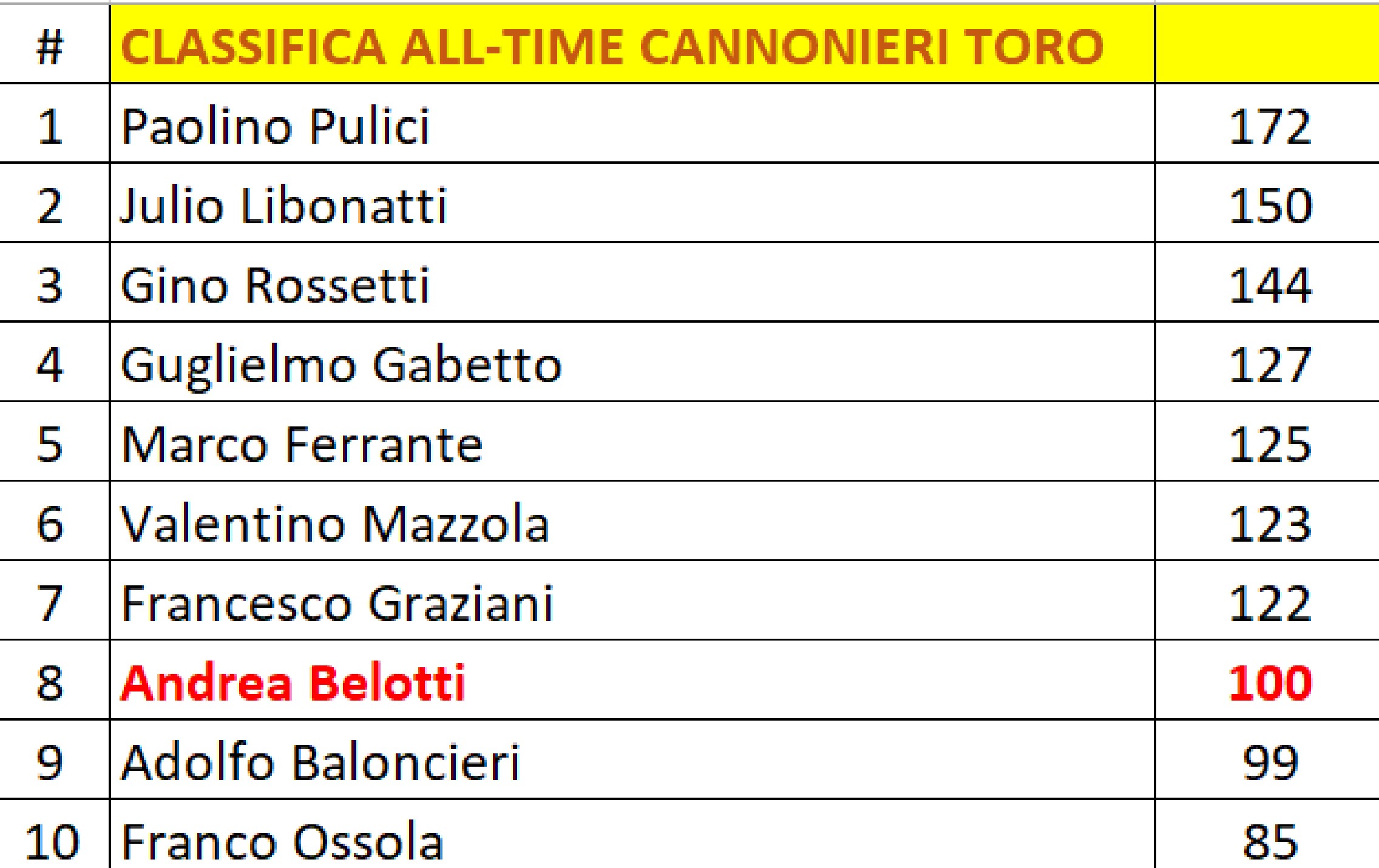 100 - Il traguardo è arrivato. Andrea Belotti ha segnato 100 gol con la maglia del Torino: un risultato incredibile, che gli consente di agganciare l'ottavo posto nella classifica cannonieri di tutti i tempi del Torino. Ma il gol arrivato contro l'Udinese, l'ottavo in questo campionato per il capitano granata, ha senza dubbio un gusto amaro. Belotti ha raggiunto quota 100 reti nella sconfitta contro i friulani in uno dei momenti peggiori per il Torino tutto: la sua rete è servita solo a fini statistici e non ha portato in dote punti per la squadra granata, che langue al terzultimo posto in classifica.