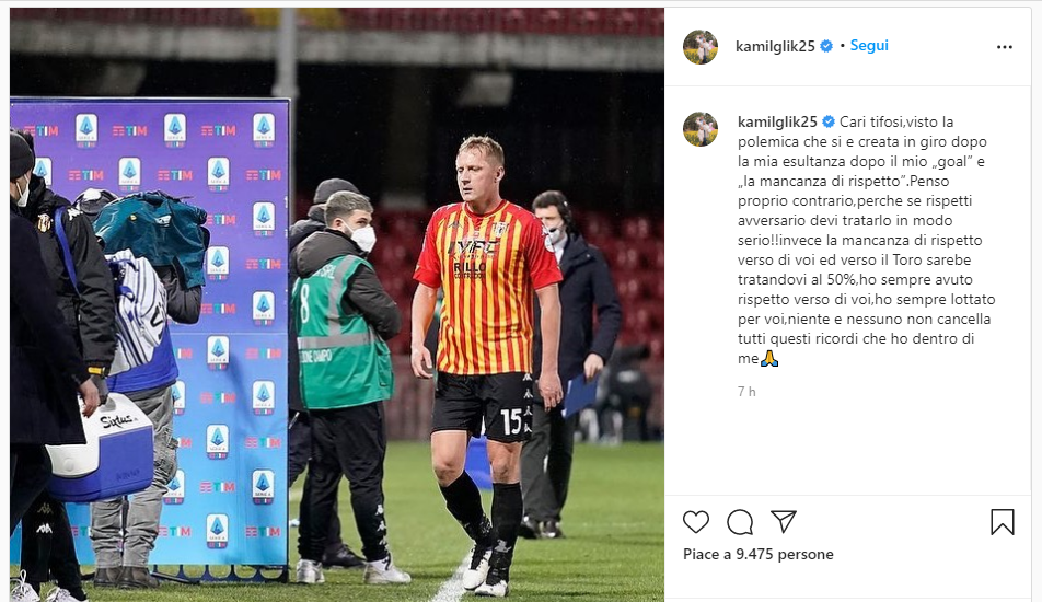 DALL'ESULTANZA ALLA RETROCESSIONE - Sono passati quasi quattro mesi (e 18 giornate di campionato) dal match dell'andata, che segnò l'esordio di Davide Nicola sulla panchina granata. Da quella partita, terminata 2-2 con la doppietta di Zaza a riacciuffare il pari nei minuti di recupero, il Torino ha collezionato 22 punti - tanti quanti ne aveva il Benevento in quel momento - mentre i giallorossi solo dieci, ritrovandosi da undicesimi all'attuale terzultimo posto in classifica, che li condanna alla retrocessione. In quella sfida, che col senno di poi si è rivelata decisiva come uno spartiacque della stagione dei due club, Glik aveva trovato anche la rete, poi annullata dal VAR. La veemente esultanza del nazionale polacco aveva acceso gli animi dei tifosi granata, che si aspettavano meno esuberanza dal loro amato ex capitano. Polemiche a cui Glik rispose dal suo profilo Instagram: "se rispetti l'avversario, devi trattarlo in modo serio" - fu la replica del difensore classe '88 - "niente e nessuno cancella tutti questi ricordi che ho dentro di me".