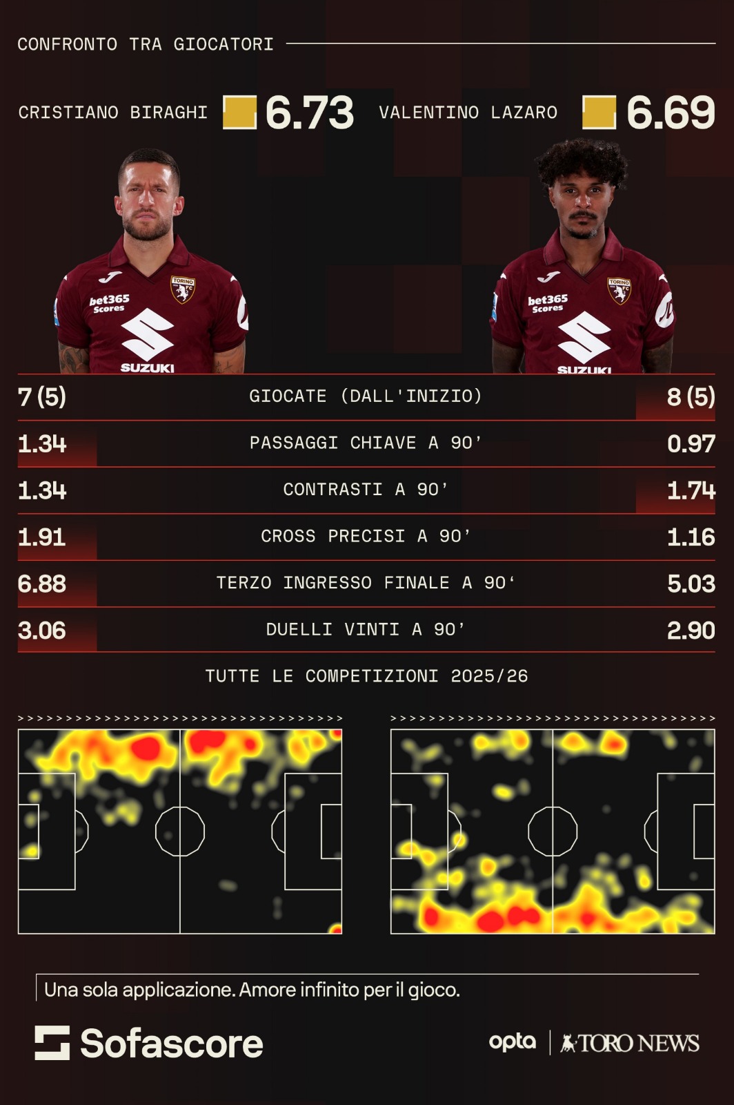 Lo stop di Nkounkou rimescola le carte in mano Baroni, non solo in vista della sfida con il Genoa, ma probabilmente anche per il match contro il Bologna. Inizialmente pensato come riserva di Biraghi, il terzino francese si era guadagnato il posto da titolare grazie alla spinta offensiva e alla resistenza fisica. Non altrettanto si può dire per il difensore italiano, arrivato a gennaio dello scorso anno e subito inserito tra i titolari da Vanoli, che ha progressivamente perso terreno nelle gerarchie del nuovo allenatore. Ora sembra avere l’opportunità di riscattarsi dopo un avvio di stagione deludente, anche se Baroni potrebbe valutare l’adattamento sulla sinistra di Valentino Lazaro, esterno destro dal piede tecnico più che dalla spinta costante. Come Biraghi, anche Lazaro era imprescindibile la scorsa stagione, ma quest’anno ha ceduto terreno, a favore di Marcus Pedersen. Vediamo i due terzini a confronto grazie alle grafiche di Sofascore.