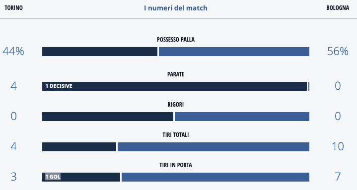Un Torino cinico quello visto contro il Bologna, che è riuscito a portare a casa tre punti nonostante la partita disputata non sia stata delle migliori. "La fortuna ce la siamo guadagnata", ha affermato Walter Mazzarri nel post-partita. I dati non smentiscono il tecnico granata, sebbene statistiche alla mano si possa dire che il risultato più giusto sarebbe stato il pareggio. Belotti e compagni si sono dimostrati concreti in attacco e solidi in difesa.