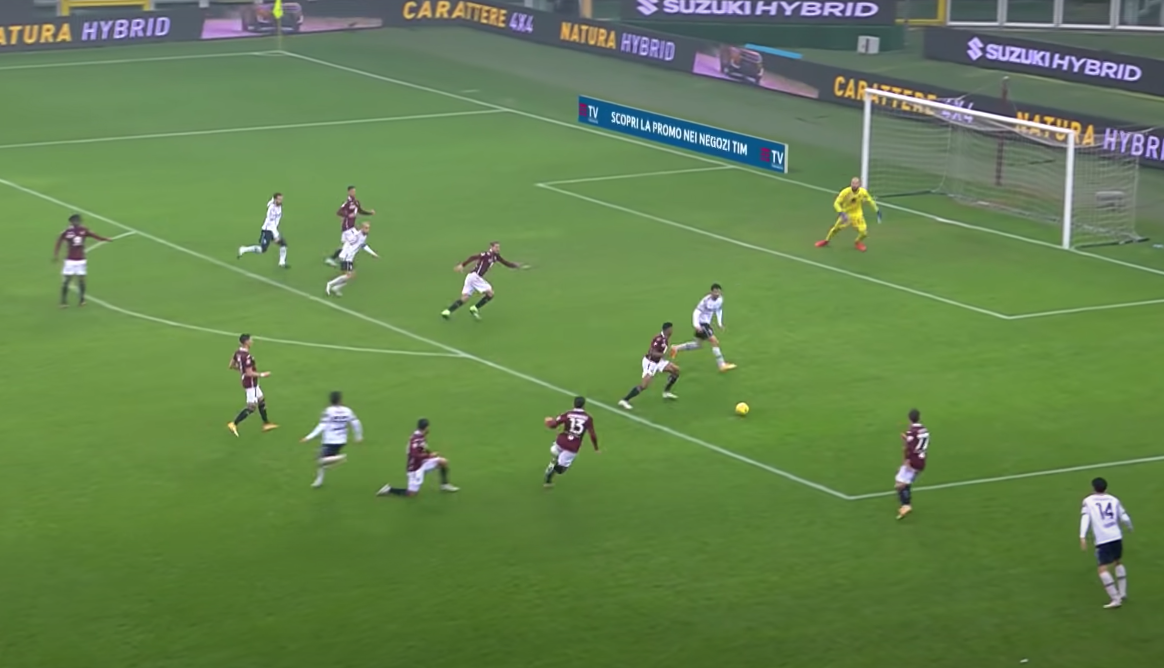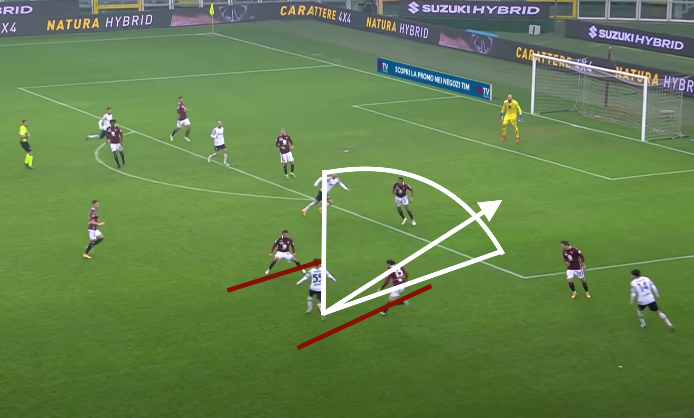 Su Vignato arriva il raddoppio di Rincon, ottima decisione del General. Peccato che sia Rodriguez sia Rincon lasciano all'esterno bolognese scoperta ogni possibile giocata verso la porta del Toro. Infatti, Vignato è coperto solamente alle sue spalle da Rodriguez, mentre Rincon copre giocate (inesistenti) verso il centro, ma nessuno dei due si preoccupa di coprire la palla. Così per Vignato il gioco è semplice: imbucata per Soriano.