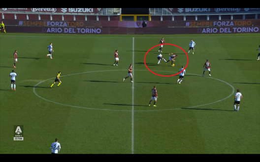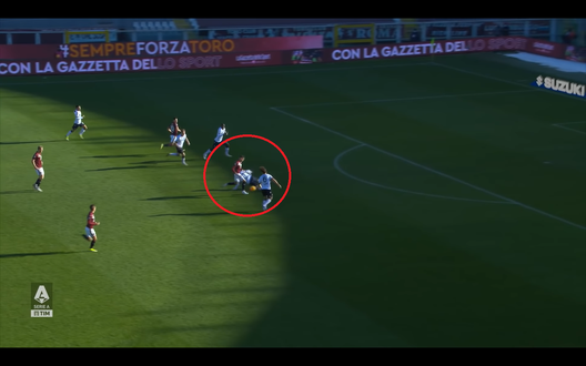 Come si può notare nell'immagine 1, è proprio Lukic che dà inizio all'azione del Toro andando a pressare Skov Olsen a centrocampo. Il numero 10 granata sradica il pallone dai piedi del giocatore del Bologna e fa partire rapidamente il contropiede granata.