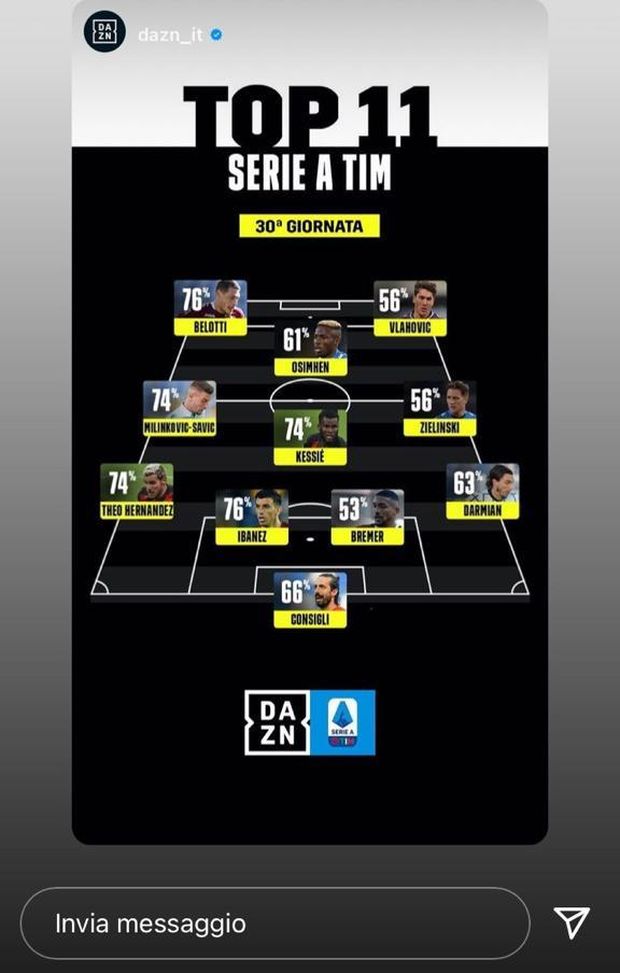 Ben due giocatori del Torino nella formazione ideale di Dazn nell'ultimo turno disputato, quello della vittoria per 0 a 1 dei granata di Davide Nicola a Udine. In difesa l'ottimo Gleison Bremer, autore di una stagione autorevole. In attacco l'uomo della partita grazie al suo gol dal dischetto, ovvero Andrea Belotti. Il difensore brasiliano ha, tra l'altro, ripostato sulla propria pagina Instagram ufficiale la grafica dell'emittente streaming che certifica la sua presenza nella top-11. In difesa con lui Ibanez, Darmian e Theo Hernandez. Zielinski insieme a Milinkovic-Savic e Kessié compone la mediana. In attacco il "Gallo" fa reparto con Vlahovic e Osimhen. Completa l'undici il portiere Consigli. Il Torino, dunque, come il Napoli e il Milan, è rappresentato da due elementi, mentre Inter, Roma, Sassuolo, Lazio e Fiorentina da uno. I due giocatori del Torino, così come gli altri, sono stati scelti dagli utenti in un ballottaggio proposto da Dazn. Bremer si è aggiudicato la sua sfida con il 53% dei voti, mentre Belotti il 76% (nessuno meglio).