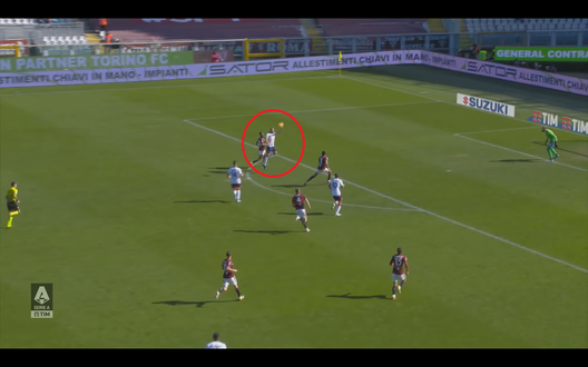 La gioia del pareggio però dura poco per i granata che vengono subito sorpassati di nuovo dal Cagliari solo 8 minuti più tardi. Durante un contropiede della formazione rossoblù, Bellanova è servito sulla destra e, lasciato nuovamente libero di agire da Ansaldi, taglia il campo con un profondo lancio lungo indirizzato verso Pavoletti (Immagine 1).