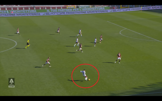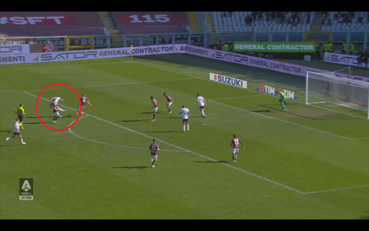 Il centrocampista dopo un controllo con la coscia destra per sistemarsi il pallone si prepara a tirare col piede sinistro (Immagine 3). La sua conclusione è davvero precisa, anche se non troppo potente, e si insacca nell'angolino alla sinistra di Milinkovic-Savic nonostante davanti al giocatore del Cagliari ci fossero ben 3 giocatori granata: Pobega, Bremer e Djidji.