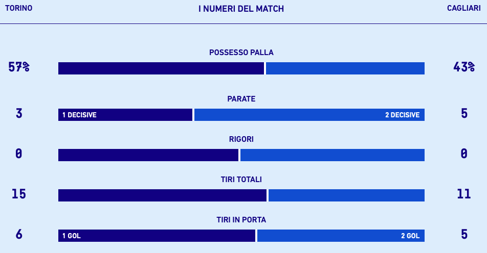 MOLE DI GIOCO - Il Toro ha creato ma il Cagliari ha retto ed ha saputo pungere i granata al momento giusto. I padroni di casa sono stati superiori in quasi tutti gli indicatori: 15 tiri (6 in porta) contro 11 (5 in porta). Le occasioni da gol sono in parità (7 a testa) ma anche sui corner il Torino è stato superiore: 4 contro 3. Dal punto di vista difensivo Gleison Bremer e compagni hanno effettuato 66 recuperi, rispetto ai 62 degli avversari. Ma Alessio Cragno ha fatto 5 parate, contro le 3 di Vanja Milinkovic-Savić. Quest'ultimo dato fornisce un segnale di quanto sia stato decisivo il portiere dei sardi.