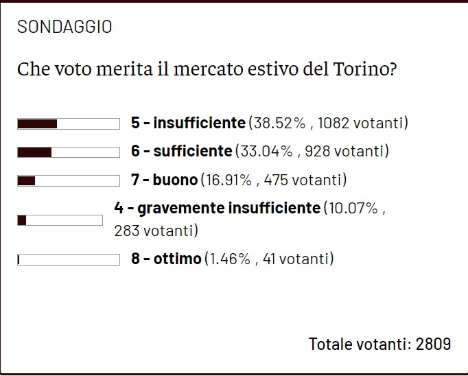 Come di consueto al termine del mercato, con il nostro tradizionale sondaggio, abbiamo voluto chiedere ai nostri lettori di dare un voto al calciomercato estivo del Torino. I votanti sono stati 2809 e hanno dimostrato una netta spaccatura: metà di questi ha considerato l'operato del club sufficiente, l'altra metà invece no. Tra chi ha valutato in modo positivo il mercato del Torino, il voto che più è stato scelto è il 6 (sufficiente), assegnato dal 33,04% dei votanti, mentre il 7 (buono) è stato scelto dal 16,91%. Solo l'1,46% l'ha considerato invece ottimo, dandogli un 8. Dall'altro lato, il 38,52% dei votanti, ovvero la maggioranza, reputa quello estivo un mercato da 5 (insufficiente), mentre il 10,07% addirittura da 4 (gravemente insufficiente).