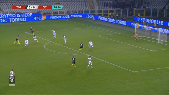 Il risultato è una perla assoluta. Maniero, il portiere del Cittadella, non si muove nemmeno perché il pallone prende una traiettoria che lo taglia completamente fuori dai giochi. Come si vede nell'immagine 3, la palla si insacca a pochi centimetri dal palo lasciando di sasso sia i giocatori del Toro che quelli ospiti. Dopo questa rete la partita si semplifica per i granata perché possono godere del vantaggio ed è un grosso aiuto psicologico per una squadra che nelle scorse settimane ha faticato molto a trovare la via della rete.