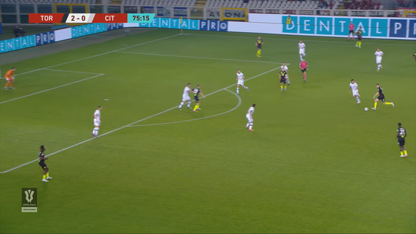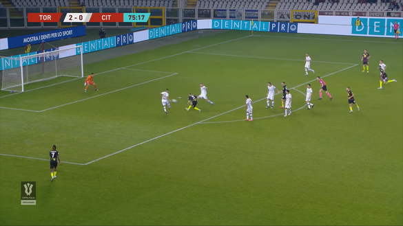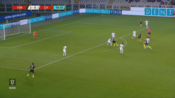 Come in occasione del 2-0 anche il terzo gol del Torino nasce da un bello scambio in cui è protagonista Vojvoda. In questo caso a dare origine all'azione è Perr Schuurs che riceve da Demba Seck in posizione centrale all'interno della metà campo e sale dalla sua posizione di centrale di difesa, confermando di avere nello sganciamento palla al piede un suo tratto caratteristico; il Cittadella ha le gomme a terra e non c'è pressione così l'olandese arriva fino sulla trequarti offensiva, come si nota nell'immagine 1.