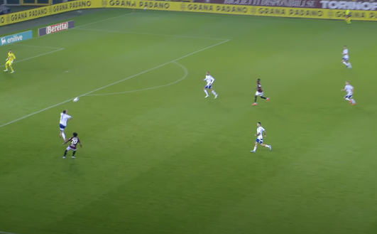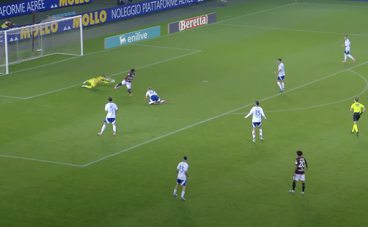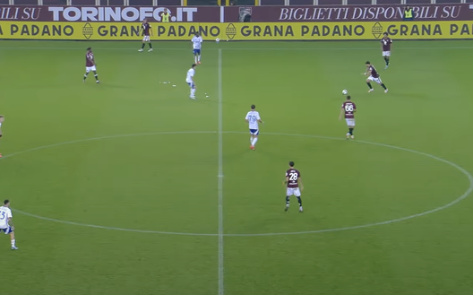L'azione del gol vittoria di Njie parte da Che Adams, che si è abbassato per costruire e cambia gioco verso Lazaro, quella del cambio gioco è stata una soluzione spesso provata dai granata per sorprendere il Como.