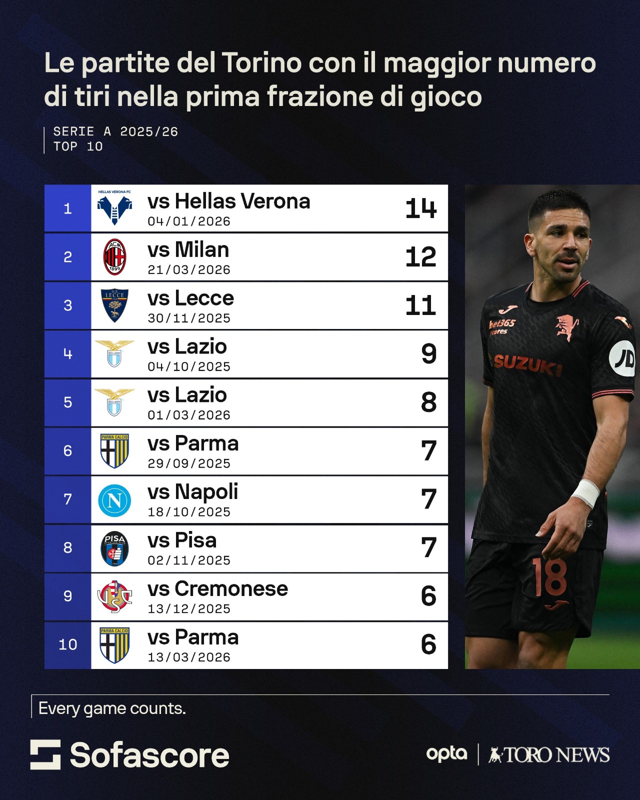 Contro il Milan si è vista una delle migliori prestazioni della stagione, almeno per quanto riguarda il primo tempo. A San Siro i granata hanno messo in campo personalità, organizzazione e grinta riuscendo a contenere i rossoneri e, a tratti, a imporre il proprio gioco. Come evidenziato dai dati di SofaScore, il Torino ha effettuato 12 tiri nei primi 45 minuti: è il secondo miglior dato stagionale - il primo resta quello del netto 3-0 contro il Verona - e racconta bene la qualità della prestazione. Anche dopo lo svantaggio (il primo), la reazione è stata immediata.