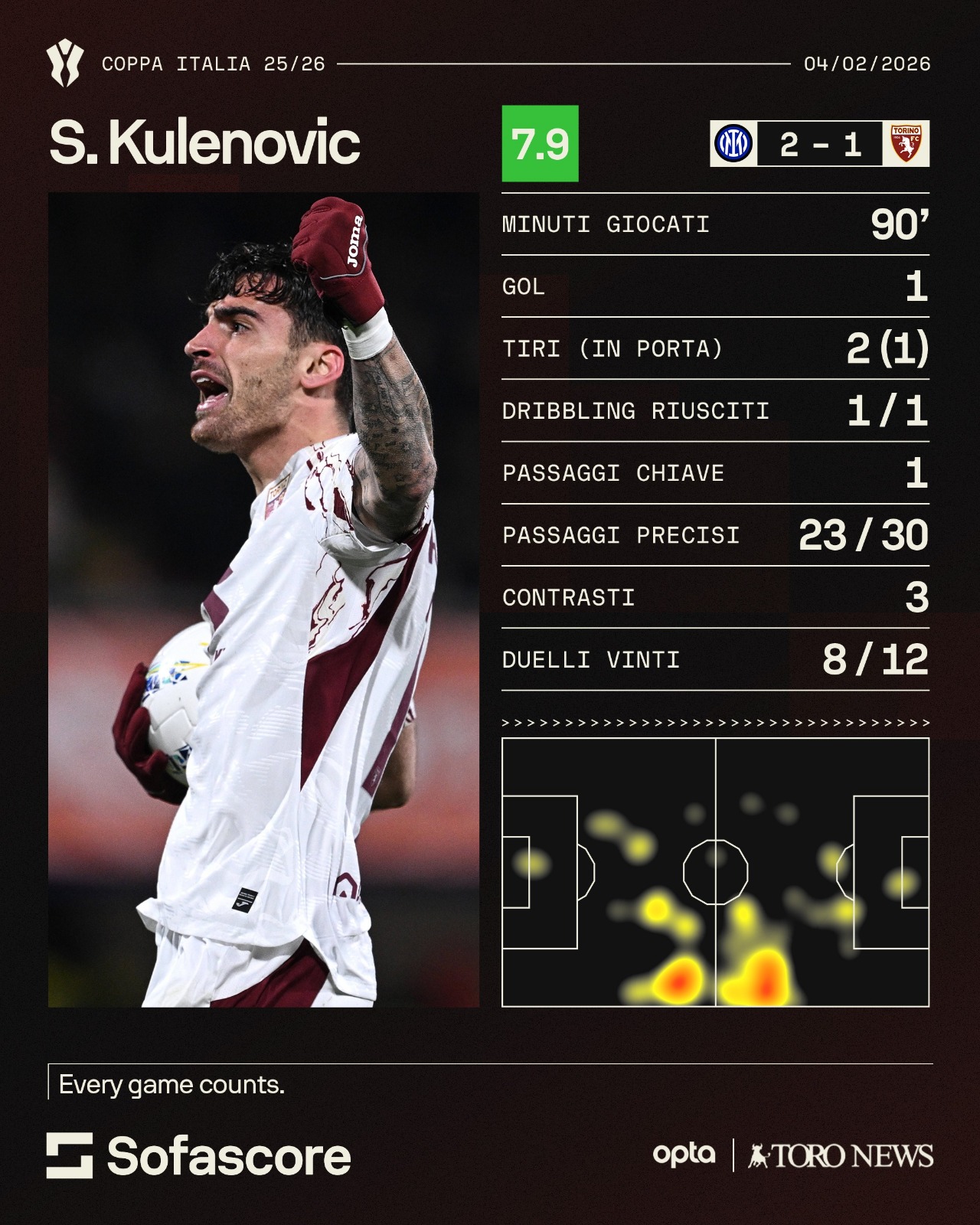 Dopo Monza, tocca di nuovo al centravanti croato. Sandro Kulenovic si è rivelato il vero trascinatore dei granata contro l'Inter nella sfida di Coppa Italia. Nonostante la sconfitta e l'eliminazione, il suo esordio dal 1' minuto con la maglia granata è stato fulmineo. Dopo aver debuttato in campionato con il Lecce, viste le assenza di Adams e Simeone, Marco Baroni ha deciso di lanciarlo dal via al fianco di Njie. L'ex Dinamo Zagabria ha risposto presente: nella ripresa insacca sul cross di Pedersen dalla destra portando il match sul risultato di 2-1. Anche se il suo gol non è bastato a evitare la sconfitta e l'eliminazione, la prestazione del croato è stata molto buona.