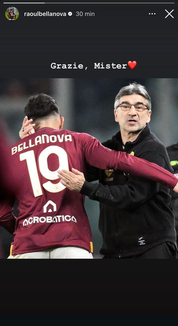 Raoul Bellanova - tra le sue storie Instagram - ha postato una foto proprio con Juric con scritto "Grazie, mister".