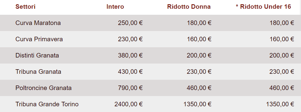 PREZZI - I prezzi per gli abbonamenti, come abbiamo riportato su queste colonne, sono aumentati di 10 euro (QUI i dettagli). Il listino va dai 230 euro in Curva Primavera, passando per i 250 in Maratona, finendo con la Tribuna Grande Torino a 2400 euro.
