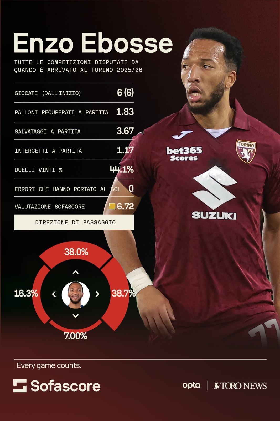 Il buon impatto del giocatore si può vedere sotto diversi punti di vista. Sei presenze da titolare confermano come abbia convinto immediatamente gli addetti al lavoro, ma un altro aspetto ancora più importante sull'affidabilità del giocatore è un altro. Zero errori che hanno portato al gol gli avversari, che conferma una grande lucidità nei momenti cruciali. Inoltre, si notano altri due fattori positivi: recupero palla e salvataggi. Nel primo dato la percentuale è di 1.83 a partita, così come gli intercetti (1.17): numeri che descrivono un giocatore più propenso alla posizione e alla chiusura che all'aggressione alta. Per quanto riguarda il secondo, si arriva a 3.67: è il suo dato più impressionante. Significa che Ebosse ha un ottimo senso della posizione e riesce spesso a sventare minacce imminenti in area di rigore (dati Sofascore)Società propensa al riscatto: col Pisa decisivo