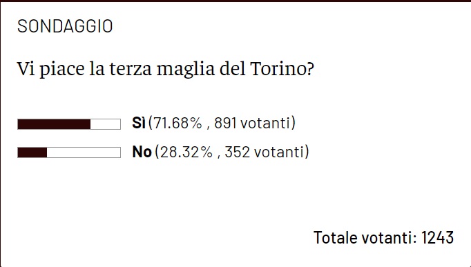 Infine la terza maglia è caratterizzata da una colorazione nera mista al granata: il colletto, le maniche e la parte laterale dei fianchi sono neri e si uniscono allo storico colore granata. Il logo del Torino e gli sponsor sono invece di colore giallo fluo. Anche in quest'ultimo caso, la maglia è stata promossa dai lettori di Toro News: 891 i "Sì" su 1243 votanti, pari all'71.68%.