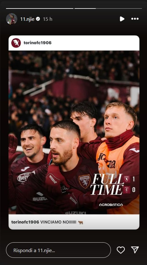 Non solo dai presenti, ma anche da casa arriva il supporto per i granata: ennesima controprova della positività nell'ambiente che Vanoli è riuscito a creare. Njie, assente ormai non da pochissimo per la frattura del malleolo, e Sanabria, fermato dal dottore, come ha raccontato il tecnico nella conferenza stampa post-partita, hanno festeggiato insieme ai compagni nelle rispettive storie Instagram.