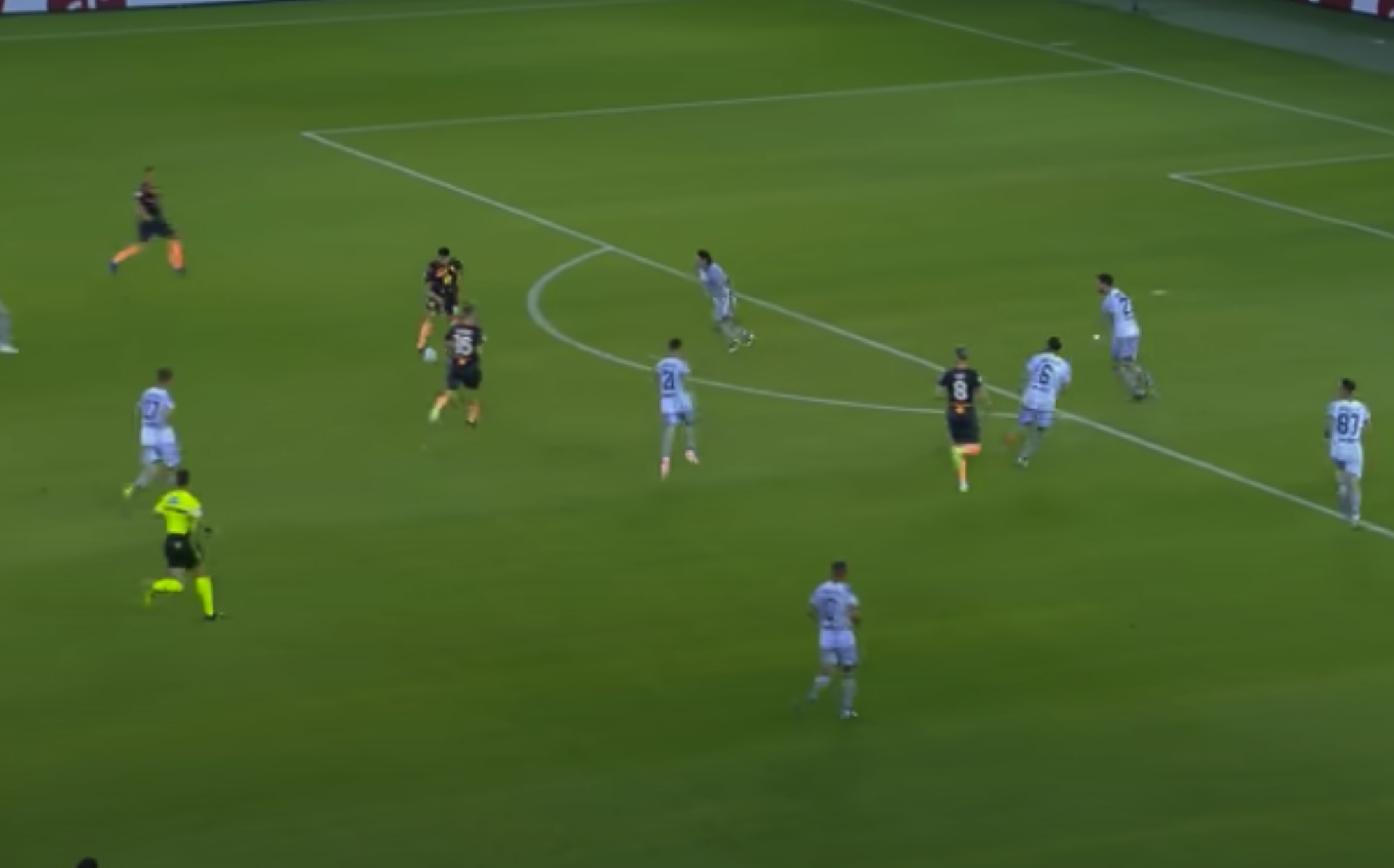 Il serbo passa la sfera a Radonjic libero sul centro-sinistra e l'ex Marsiglia la gioca subito di prima di tacco a Vojvoda.
