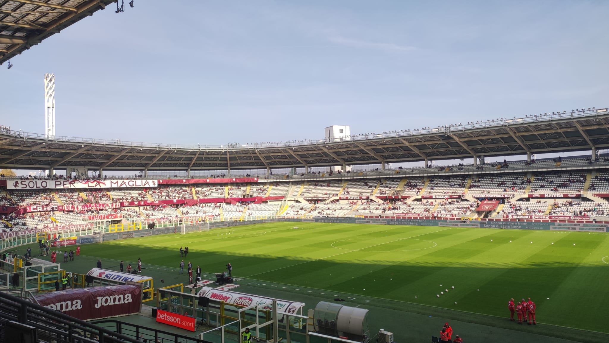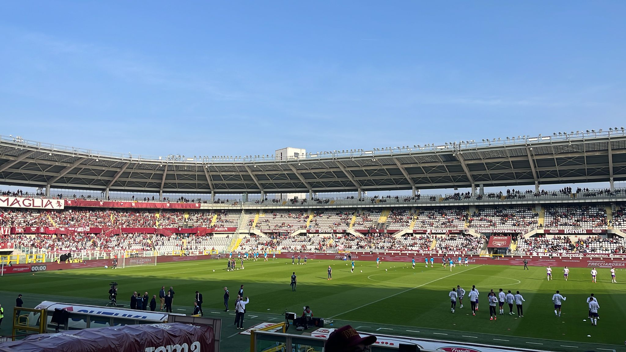 14:22 - Infine scendono in campo, tra gli applausi, i giocatori di movimento del Toro per il riscaldamento