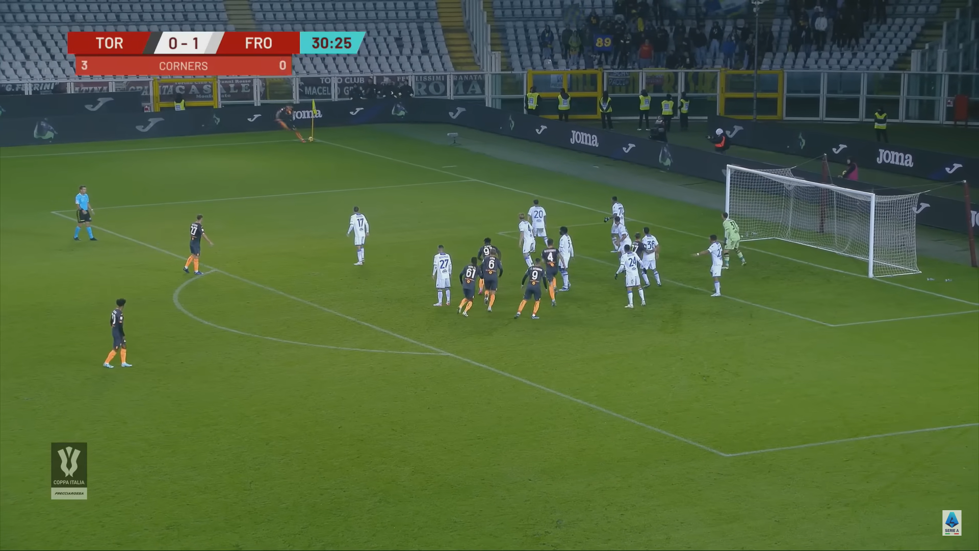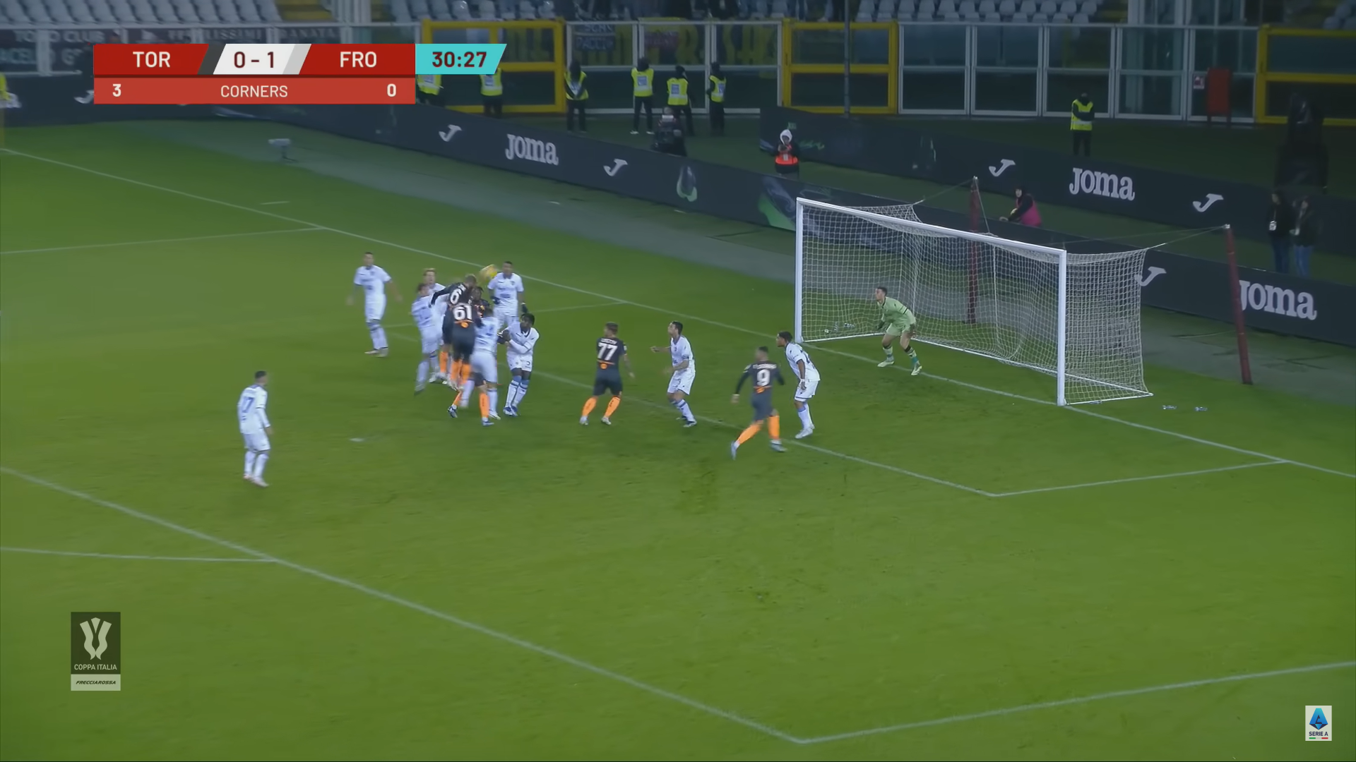 Al 31' il Torino trova poi la rete del pareggio. L'analisi dell'azione in questo caso è molto semplice e vanno dati grandi meriti a Gineitis. Come si vede nell'immagine 1 il lituano batte un corner dalla bandierina a sinistra e in mezzo all'area il Toro può contare su abili saltatori come Buongiorno, Tameze, Zapata e Zima.