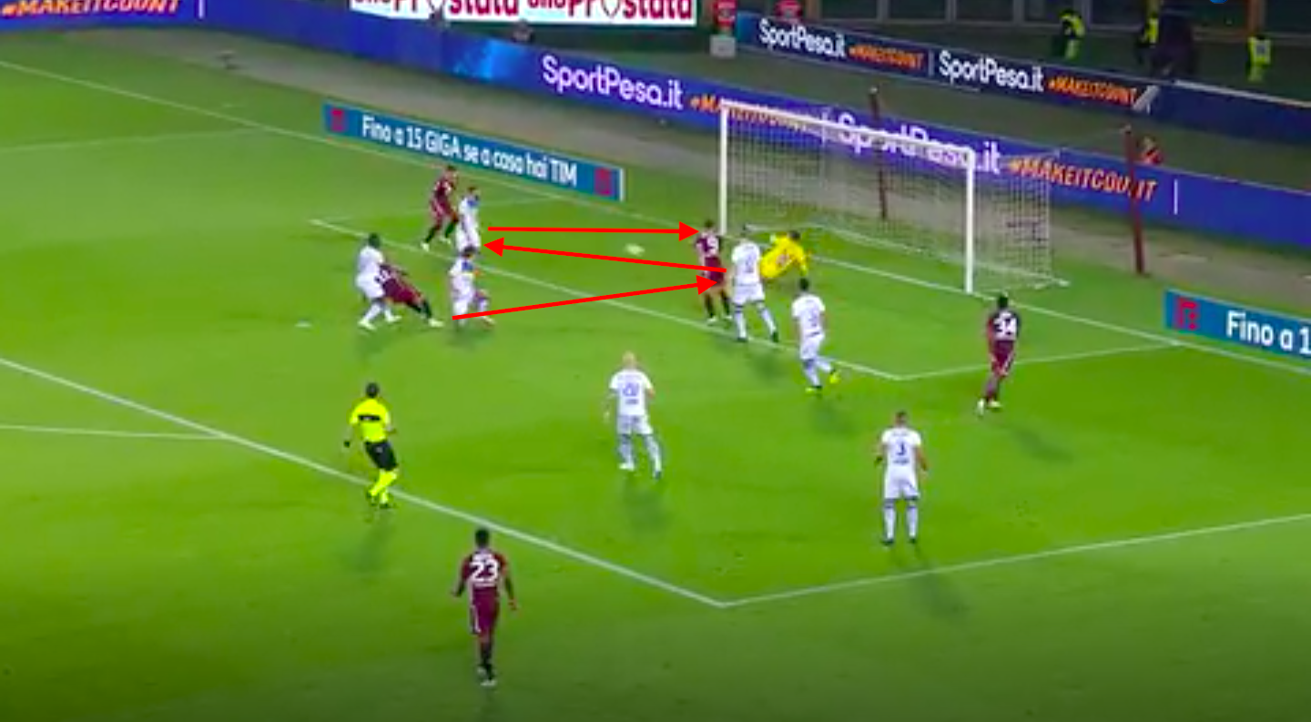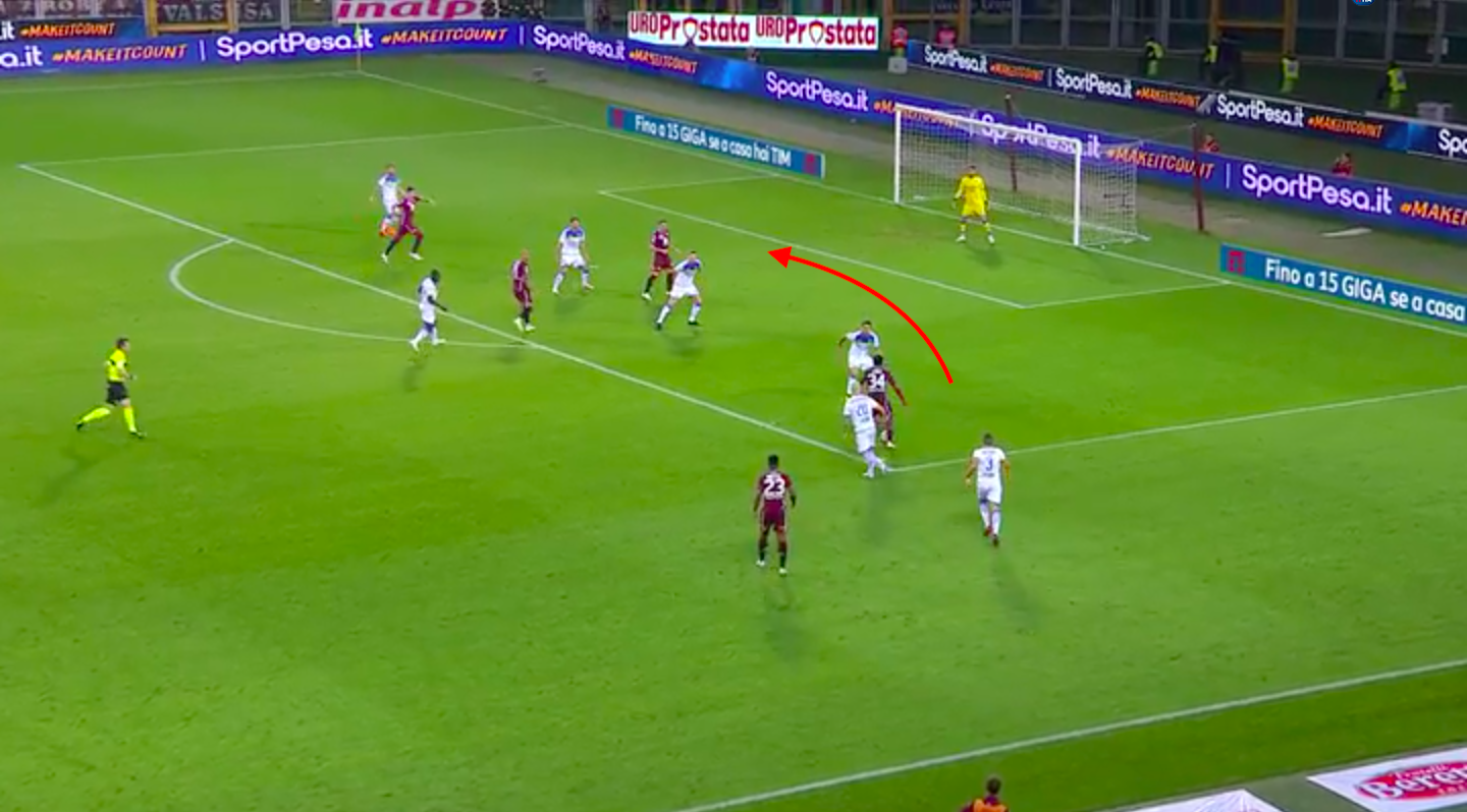 Il secondo goal granata, in apertura di ripresa, nasce dalla fascia destra. Ola Aina va in percussione ed entra in area dribblandone due. Poi scarica al centro, dove arriva a botta sicura Zaza.