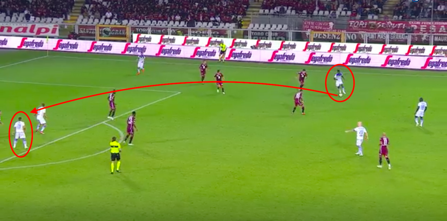 Colpevole la difesa granata che lascia il numero 28 gialloblù troppo solo all'altezza del dischetto del rigore. Il colpo di testa è chirurgico e Sirigu non può far altro che raccogliere il pallone in fondo al sacco. Doppio errore del Toro che prima lascia a Campbell tutto il tempo per crossare, e poi lascia solo anche Ciano, che riporta (momentaneamente) la parità.