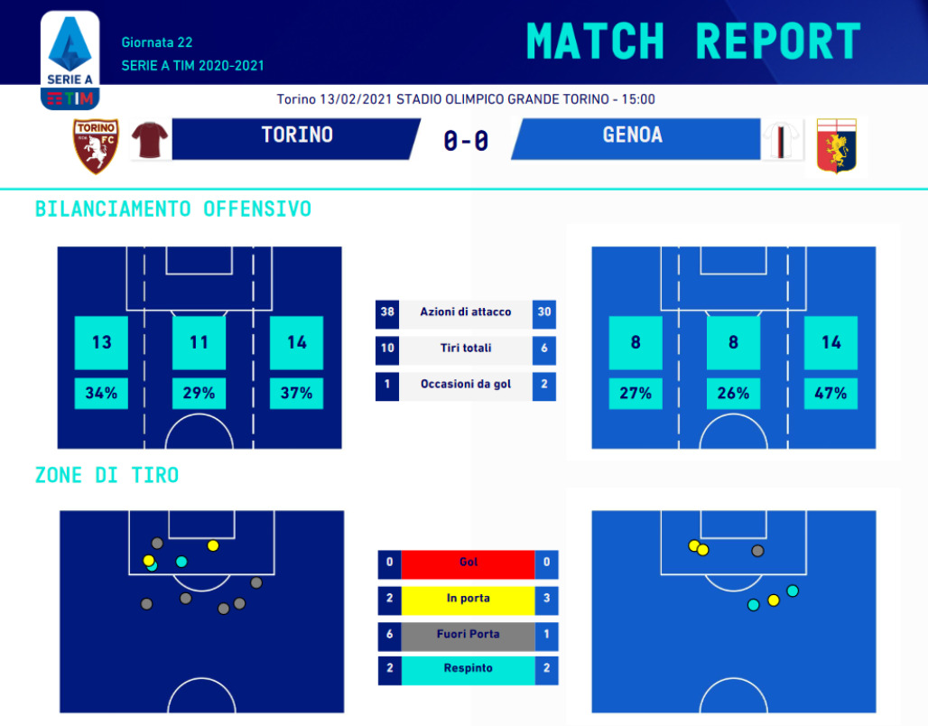 Ancora un pareggio per il Torino, che centra il quarto punto consecutivo sotto la gestione di Davide Nicola, ma che rinvia per l'ennesima volta l'appuntamento con la prima vittoria casalinga di questa stagione. Secondo i dati del match diramati dalla Lega Serie A, si è trattato di un pareggio tutto sommato giusto. La gara contro il Genoa di Ballardini è trascorsa in sostanziale equilibrio sin dal fischio d'inizio. Lo testimonia per esempio il dato relativo al possesso palla: 48% la percentuale gestita dai granata, 52% quella controllata dai liguri.