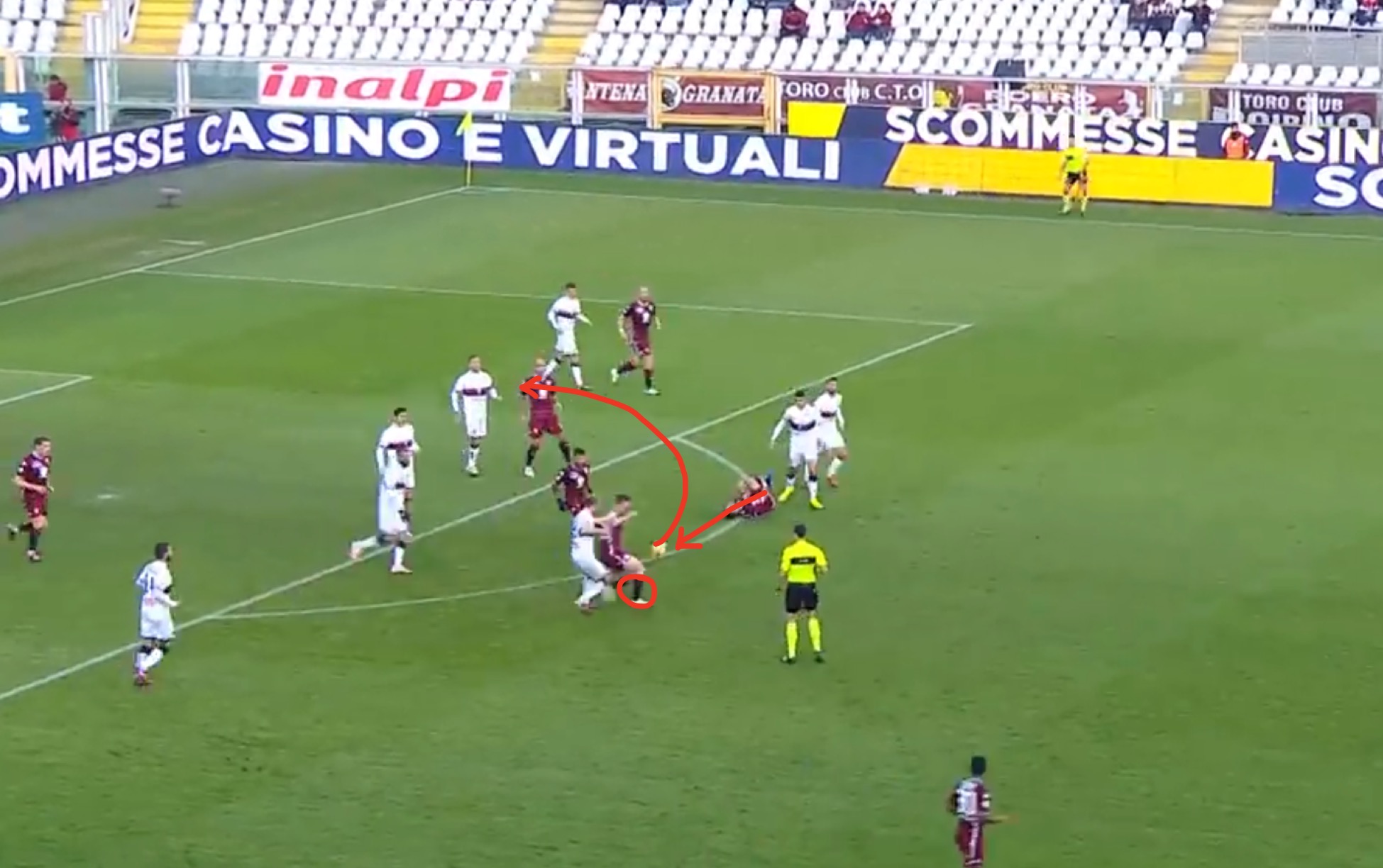 In pieno recupero della prima frazione di gara, De Silvestri tocca il pallone dentro l'area, ci arriva Romero che però sbaglia lo stop. Rincon capisce l'occasione propizia e s'avventa sul difensore centrale.