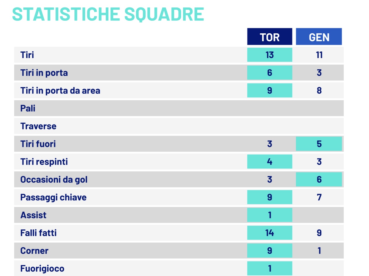—Il Torino ha tenuto palla e campo: possesso 57%, 419 passaggi riusciti con 83% di precisione (Genoa 287 all’80%). In avanti i granata spingono di più (211 passaggi progressivi contro 134), usano anche il cambio gioco (38 passaggi lunghi vs 19) e pareggiano nei recuperi (46-46). Più falli granata (14-9) e più palle perse (71-50), effetto collaterale dell’intensità e dell’alto volume di cross.