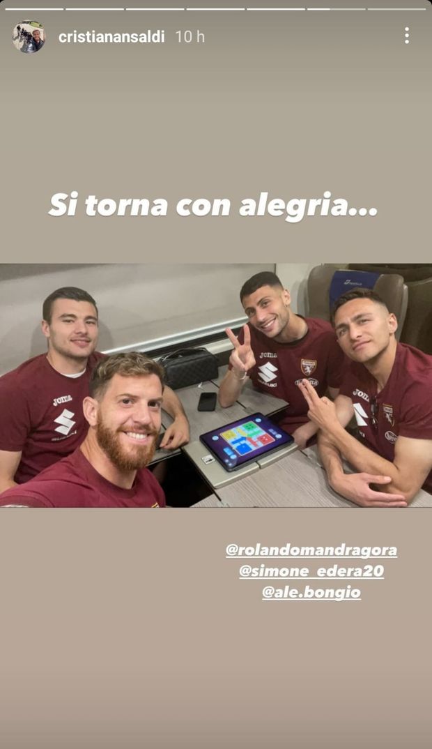 Juric lo ha inserito nuovamente nel secondo tempo ma, quando è entrato, Ansaldi ha comunque dato il suo contributo. Come sempre molto attivo sui social, l'argentino nel post-gara ha pubblicato questa story in compagnia di Buongiorno, Edera e Mandragora. "Si torna in allegria" è il suo commento.