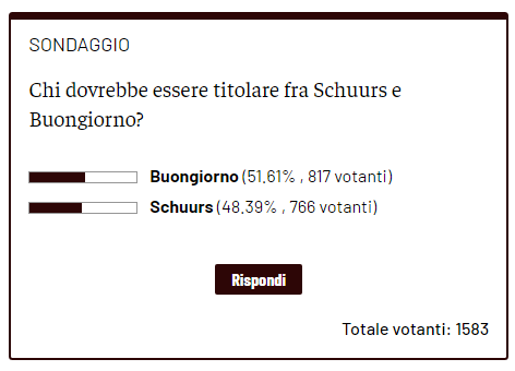 Quasi un testa a testa, ma Buongiorno alla fine ha la meglio su Schuurs. Gli scorsi giorni vi abbiamo chiesto chi tra i due difensori avreste schierato dal 1' di gioco contro l'Inter a San Siro al centro della difesa e i risultati sono i seguenti, nessun plebiscito, quasi alla pari: su 1.583 votanti totali, 817 (pari al 51,61%) hanno scelto Buongiorno, mentre il restante (766 - 48,39%) ha espresso la propria preferenza per il nuovo arrivato Schuurs. Adesso non ci resta che attendere le formazioni ufficiali per scoprire come Juric e Paro hanno deciso di schierare la squadra, ma soprattutto chi saranno gli interpreti che partiranno titolari.