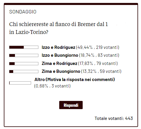 Il Torino al momento vanta la quinta miglior difesa del campionato di Serie A, con soli 30 gol subiti in 31 gare. Nel sondaggio di ieri - giovedì 14 aprile - noi di Toro News vi abbiamo chiesto, infatti, chi schierereste dal 1' di gioco contro la Lazio al fianco dell'inamovibile Bremer. Il 49,44% dei lettori (pari a 219 votanti su 443 totali) farebbe affidamento su Izzo e Rodriguez per completare il tridente difensivo. Solo il 18,74 %, invece, sceglierebbe Izzo e Buongiorno. Mentre al terzo gradino del podio troviamo Zima e Rodriguez con soli 79 voti, pari al 17,83%.