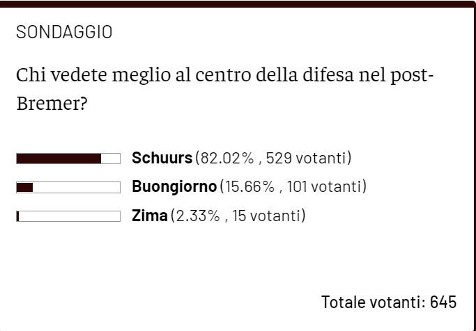 I lettori di TN non hanno dubbi: l'erede di Gleison Bremer al centro della difesa del Torino deve essere Perr Schuurs. Nella giornata di ieri, giovedì 22 settembre, infatti, vi abbiamo chiesto, tramite un classico sondaggio settimanale, chi, secondo voi, interpreterebbe al meglio il ruolo di centrale difensivo tra Schuurs, Buongiorno e Zima. I risultati del sondaggio non hanno lasciato spazio ad interpretazioni. Il difensore olandese è stato scelto da 529 votanti su 645, l'equivalente dell'82,02%, mentre Buongiorno e Zima hanno raccolto soltanto, rispettivamente, 101 voti (15,66%) e 15 (2,33%). Ora la decisione spetta ovviamente a Ivan Juric ma l'idea dei tifosi granata in tal senso sembra essere piuttosto chiara.