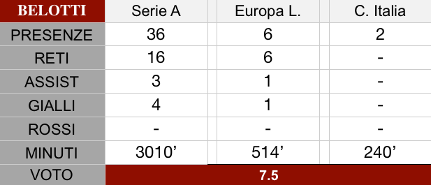 Andrea Belotti non ha deluso neanche questa stagione, nonostante il rendimento negativo della squadra. Nel contesto di una squadra che non ha mai giocato un calcio propositivo, il Gallo non ha mai fatto mancare il proprio apporto e con i 16 gol siglati in campionato si è rivelato decisivo nel far raggiungere i 40 punti ai granata che hanno significato la permanenza in Serie A. Tra le prestazioni memorabili di questa stagione la trasferta di Roma, dove con due gol ha deciso la partita. Ma soprattutto il Gallo ha risposto presente da vero leader nel delicato finale di stagione: quando più serviva ha risposto presente, azzeccando un record personale di sette gare a segno consecutivamente. L'attaccate non è riuscito a raggiungere il filotto di 8 gol in 8 gare consecutive di Franco Ossola, ma ci è arrivato davvero vicino: a Firenze lo ha fermato solo il palo, così come nella gara successiva contro il Verona. Si è messo sulle spalle la squadra, assumendosi le responsabilità da capitano, cercandola di portare fuori dal tunnel in cui si era infilata e riuscendo comunque a condurla alla salvezza. La quinta annata granata di Belotti lo ha visto assumere definitivamente i panni del capitano vero e del leader imprescindibile per questa squadra. Da lui il Torino deve ripartire per sperare in un futuro più roseo.